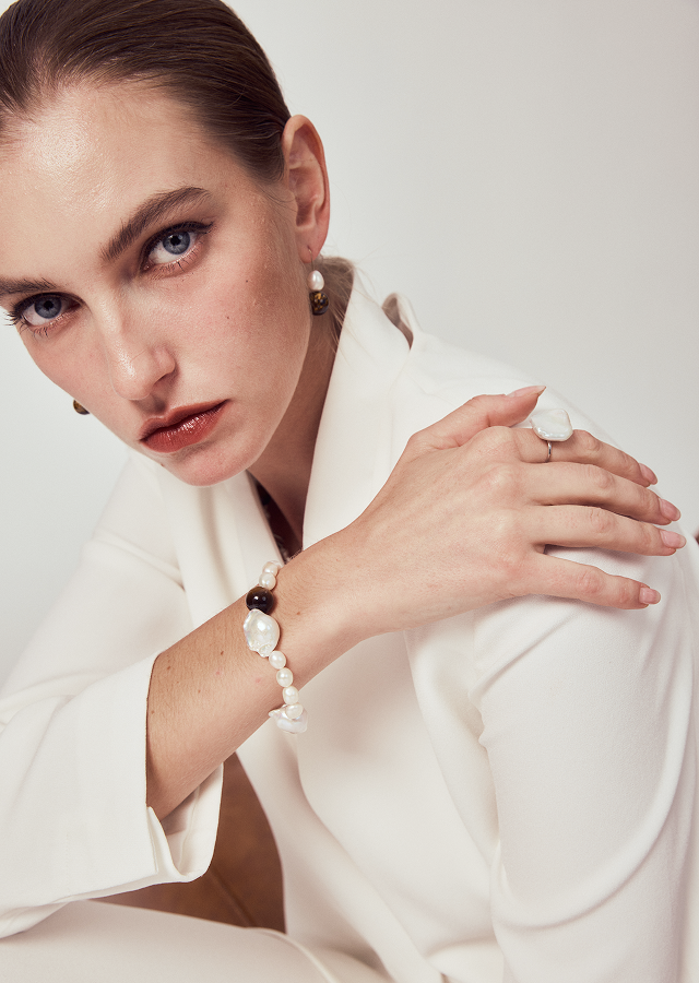 I wear my Baroque Hour necklace with both gold and silver pieces and it still works. Don’t be afraid to mix metals – the organic pearl kind of ties everything together.